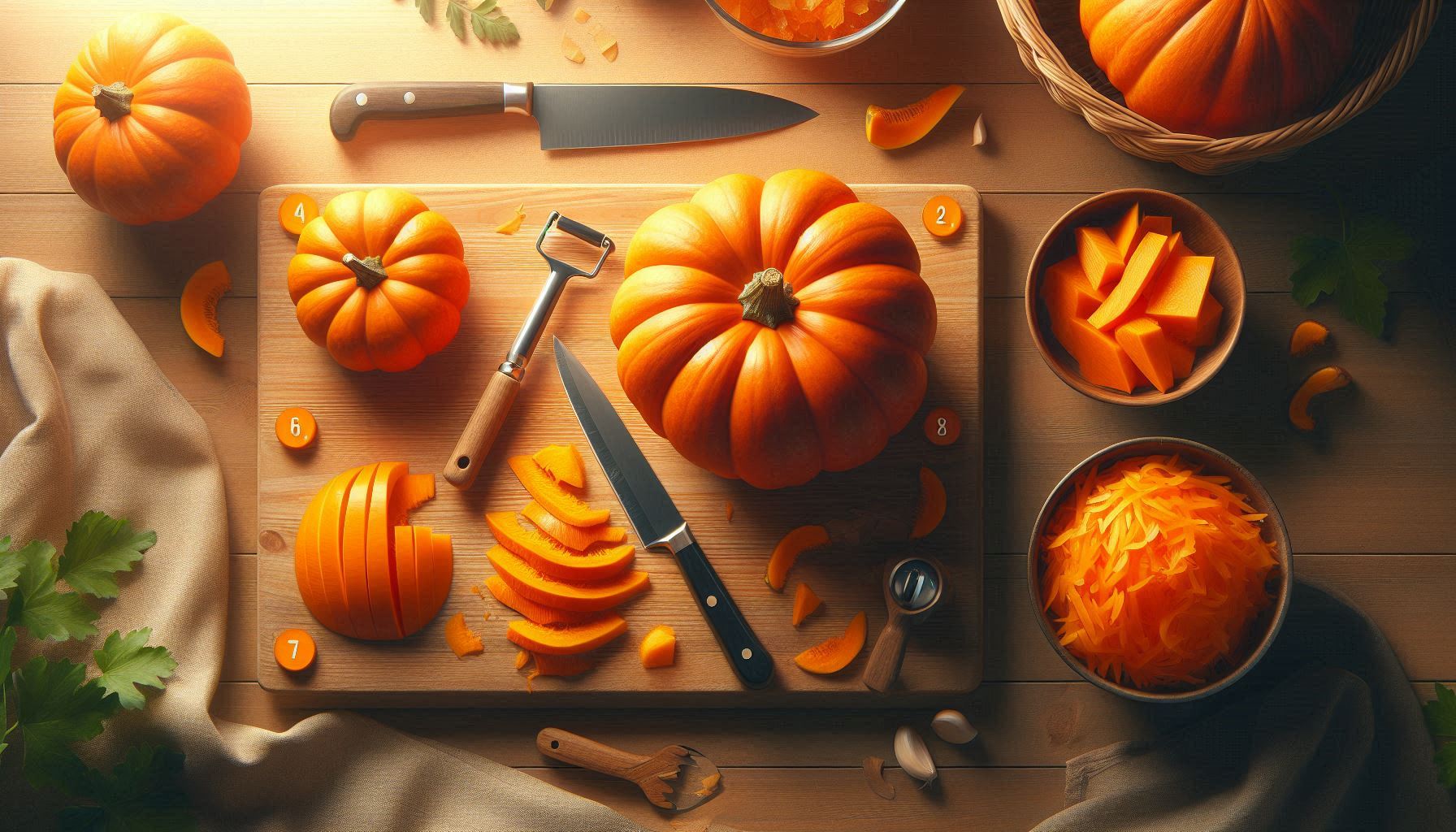 - 切る:かぼちゃを使いやすい大きさ(くし形、または一口大より少し大きめ)に切り、種とわたを取り除きます。
